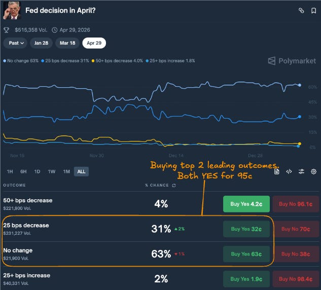 Before crystallization (40+ days out): When probability remains dispersed across multiple outcomes (e.g., 63% “No Change”, 31% “Cut 25 bps”), traders can allocate exposure across the two leading scenarios at a combined cost below $1. As odds compress toward the crystallization point, one outcome typically dominates, allowing profitable exit before full crystallization.