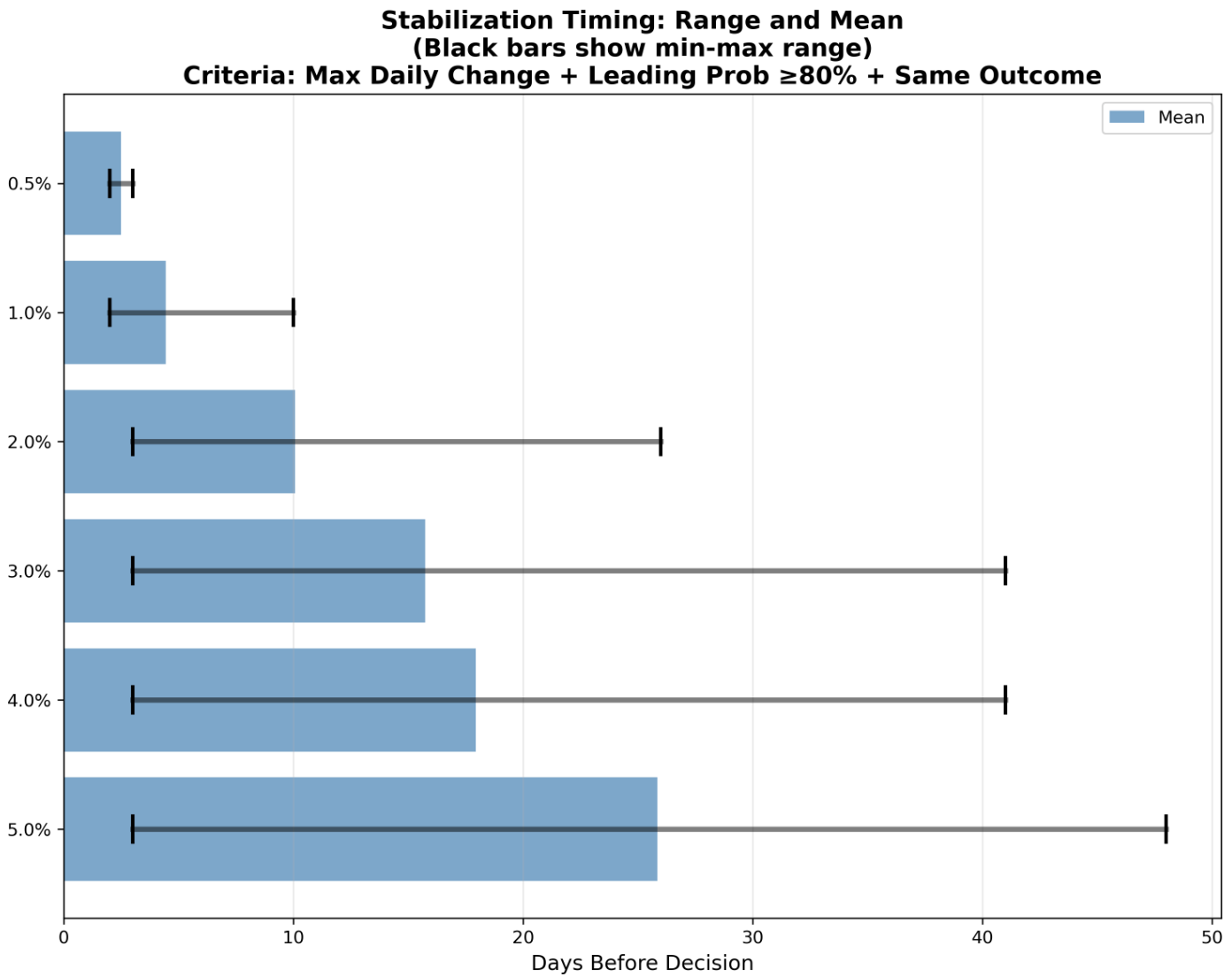 Once the blackout period begins, new information flow slows sharply. As shown earlier, odds movements during this phase are driven more by positioning than fundamentals, reinforcing why crystallization typically occurs ~26 days before the decision.