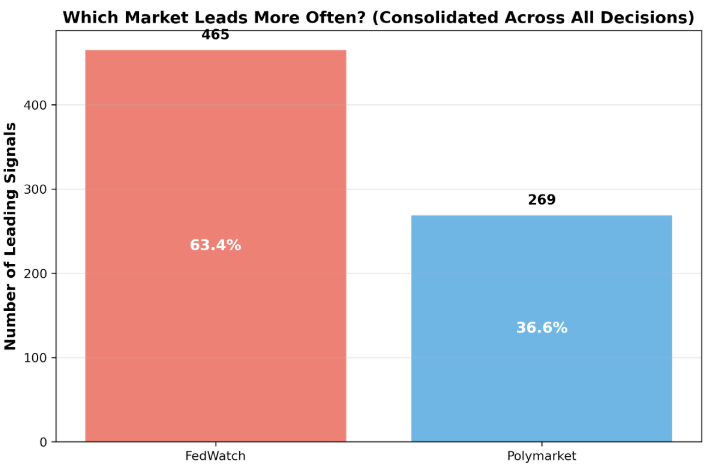 Per diagram 5 and 6, across four recent Fed meetings (Jul to Dec 2025), CME FedWatch led Polymarket 63.4% of the time, with Polymarket adjusting on average 1.44 days later. Early-cycle gaps are largest 40-60 days before a decision but these differences compress sharply as the meeting approaches. By the final few weeks, probability gaps typically narrow massively, indicating convergence toward a shared consensus. This pattern suggests that institutional pricing often pulls retail odds, rather than the other way around.