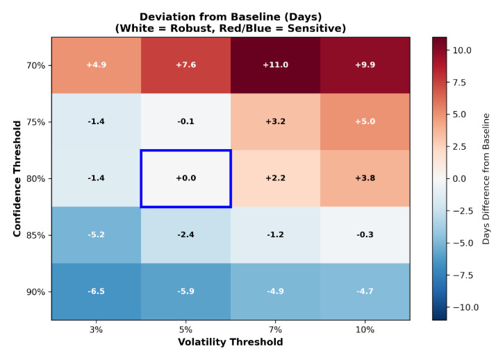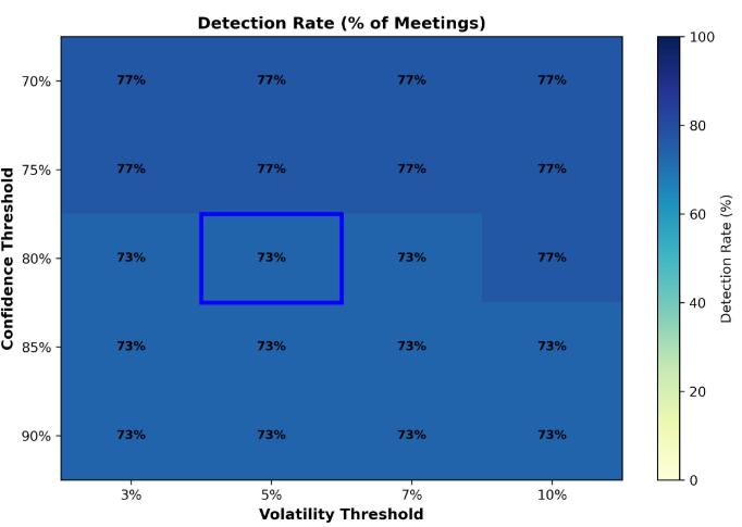 Diagram 3 shows the baseline with mean crystallization timing of 25.8 days and stabilization detected across 73% of meetings. With that being measured, the 80% confidence and 5% volatility thresholds are considered robust. Varying these parameters by ±5 percentage points shifts crystallization timing by at most 5 days, while more extreme settings either detect noise too early (prone to macro-driven reversals) or miss consensus formation.