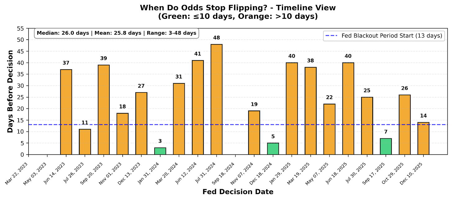 These markets crystallize far earlier than you expect ~86% of the time (19/22 times), where consensus forms weeks before the meeting.