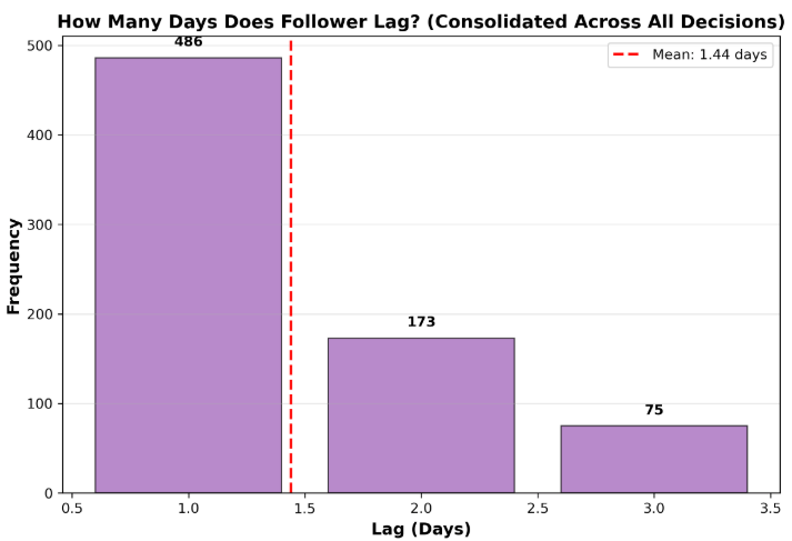 This lead-lag relationship matters because it reveals that Polymarket is reacting rather than discovering. The ~1.44 day lag likely reflects an information and liquidity gap. Potentially, institutional traders in Fed Funds futures have direct access to comprehensive sell-side research, proprietary macro models and deeper liquidity, allowing immediate position adjustments.