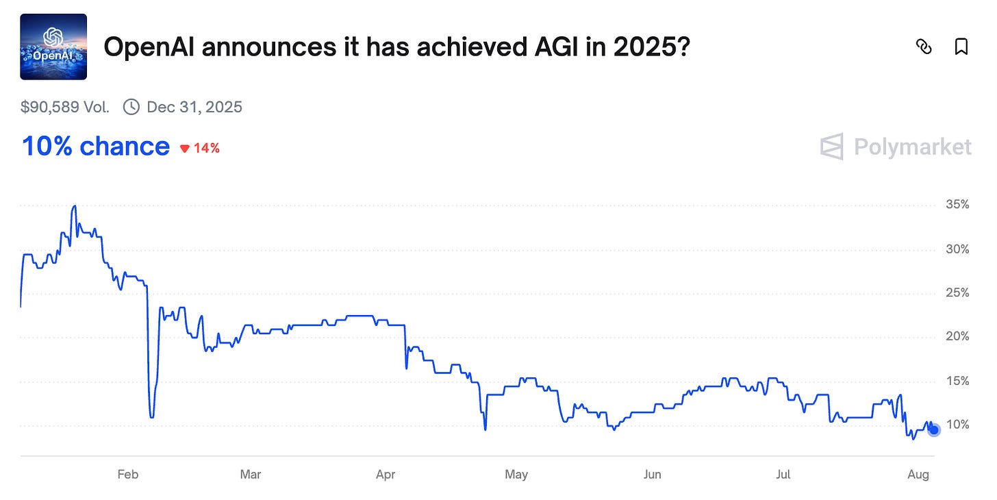 While Altman said he thinks "AGI will probably get developedā during Trump's term, odds for OpenAI to declare AGI this year have cooled dramatically, down to 10% from a high of 34% in February.