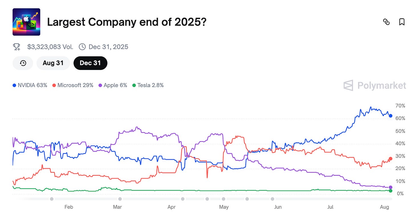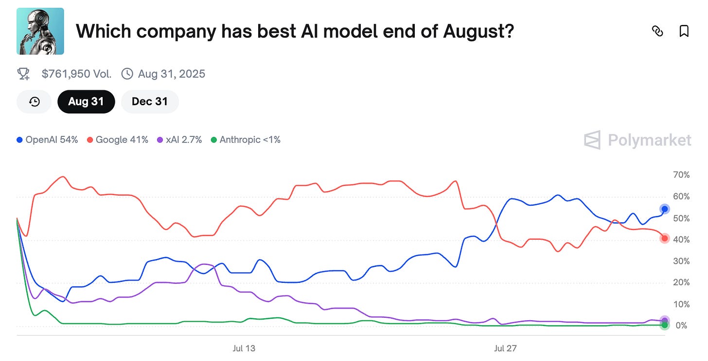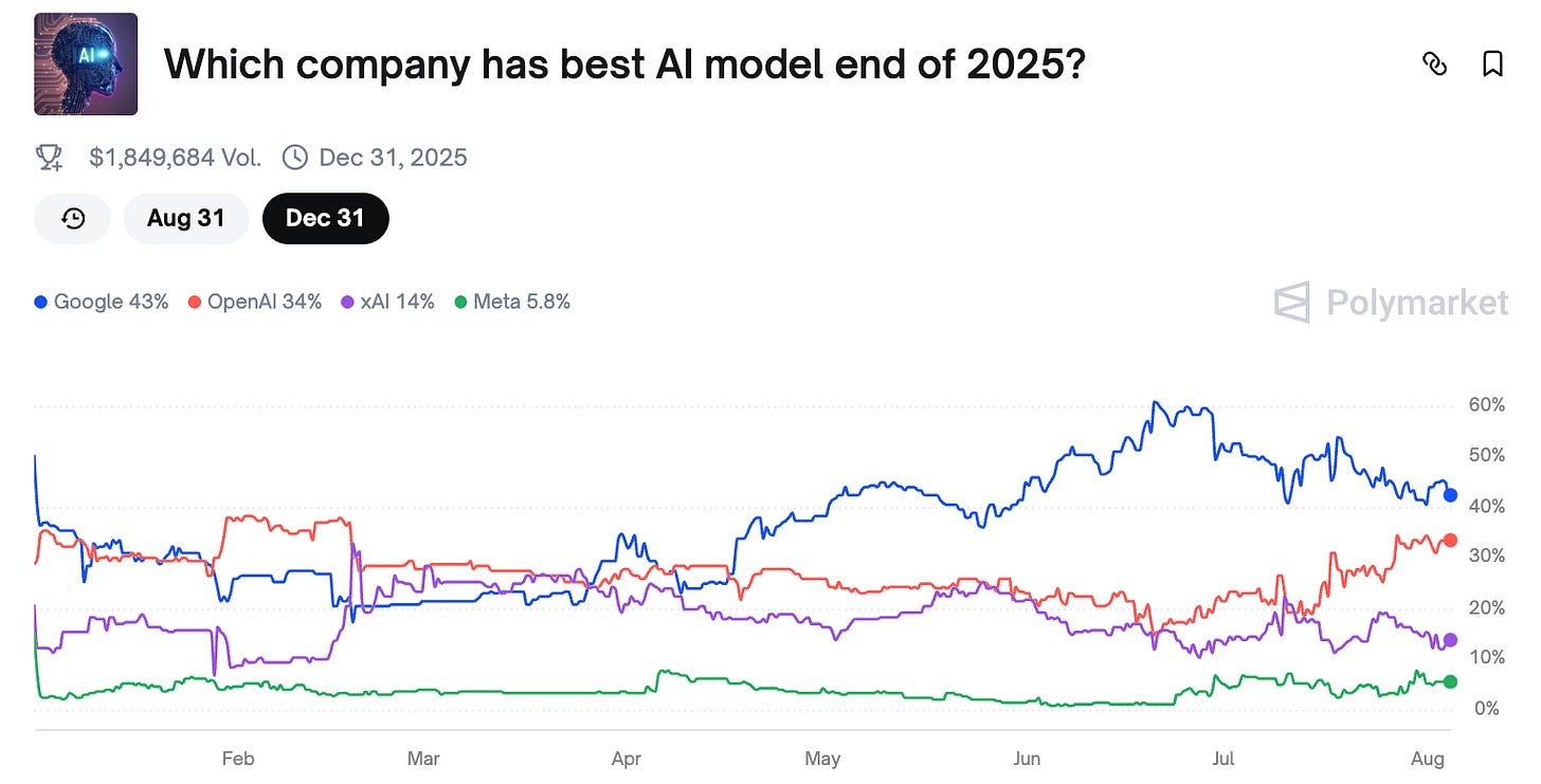 Open AIās GPT-5 is a 50-50 bet to top Gemini in August. But by the end of the year itās still an open ballgame, with Google in the lead at 43% to OpenAIās 34%.