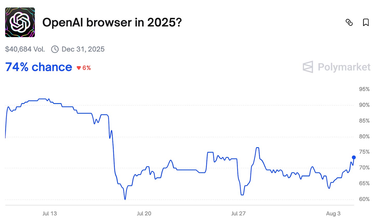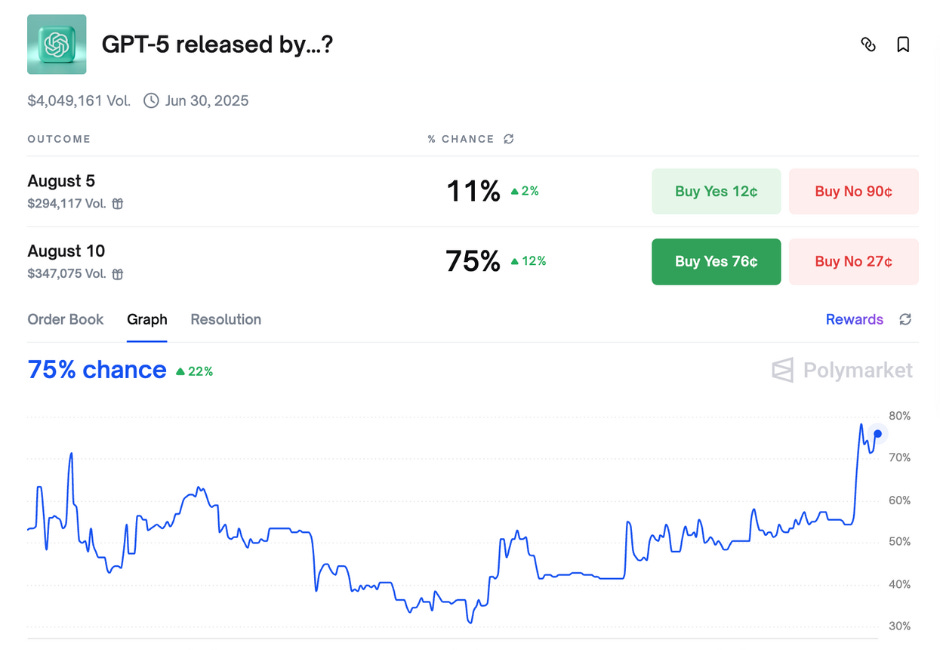 On all timeframes, Polymarket odds for GPT-5 to drop soon have been increasing, with a 75% chance that the model is released by Sunday, August 10.