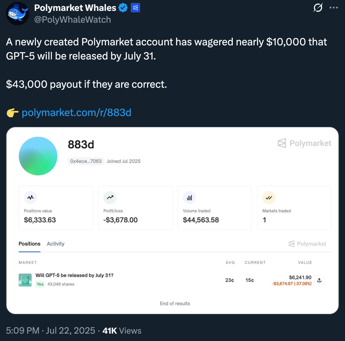 Some have speculated that heavy buys from new accounts on the GPT-5 release polymarkets to be insiders buying.