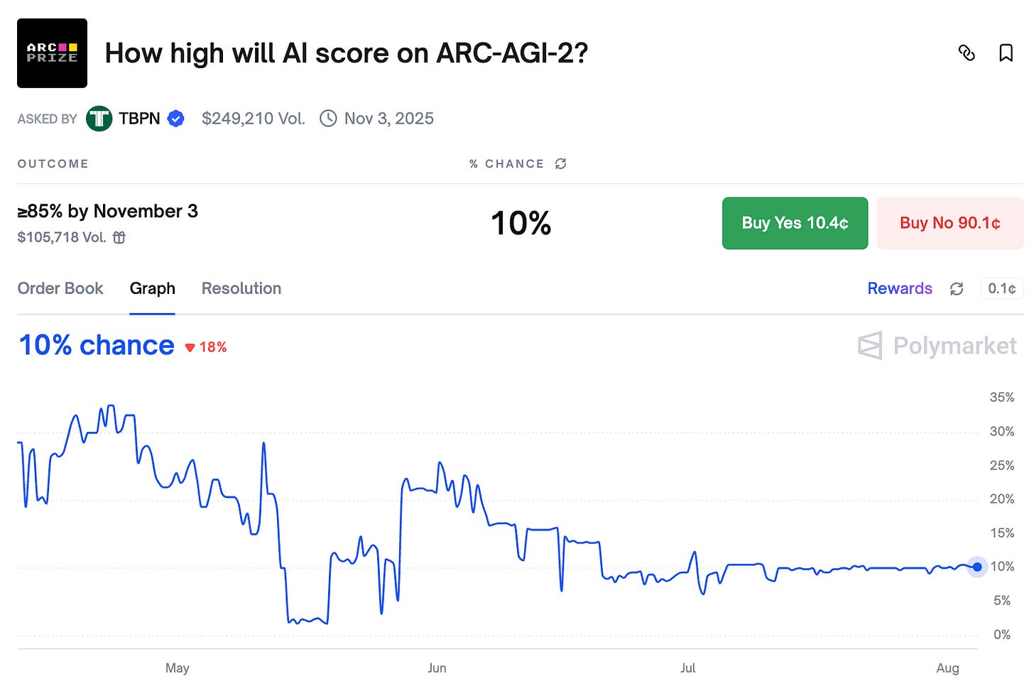 Similarly, there is a 10% chance that any AI model will score above 85% on the independent ARC-AGI-2 benchmark by November 3 of this year.