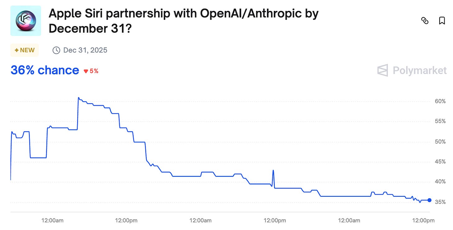 Apple, dogged by its slow progress on AI, has seen the largest drop in odds this year, falling from 54% in March to 6% odds today.