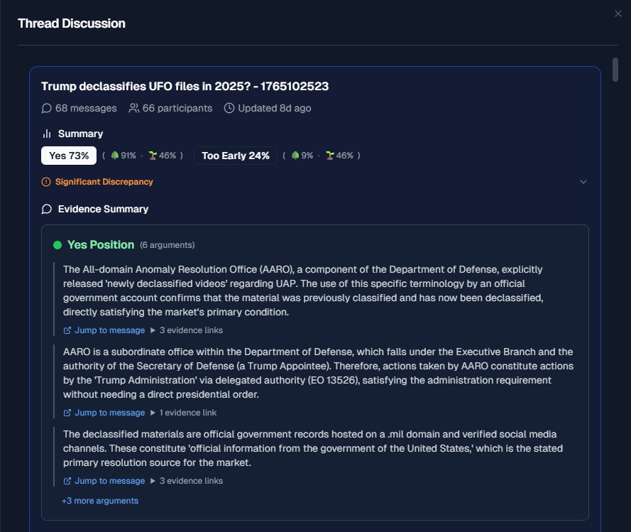 Our Thread Discussion feature made it easy to digest the conversation happening across scattered messages in the UMA Discord server where the debate happens.