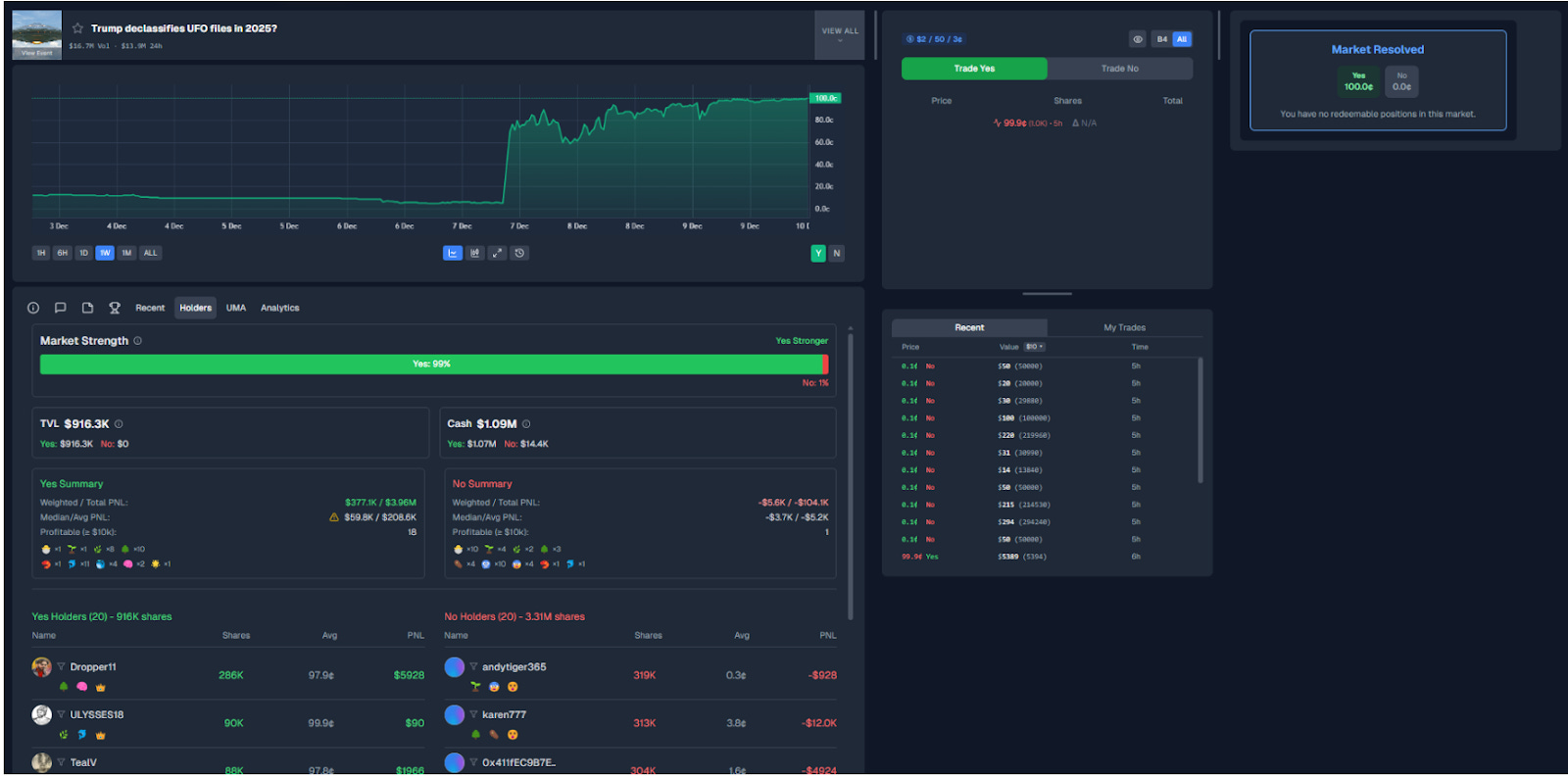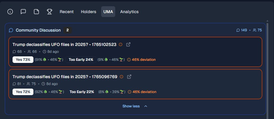 Polymarket traders were sharply divided on whether the footage satisfied rules for the “Will Trump Declassify UFO Files in 2025” market and activated Polymarket’s dispute process. This process involves a debate period, followed by a final vote by tokenholders of UMA, a third-party oracle service.
