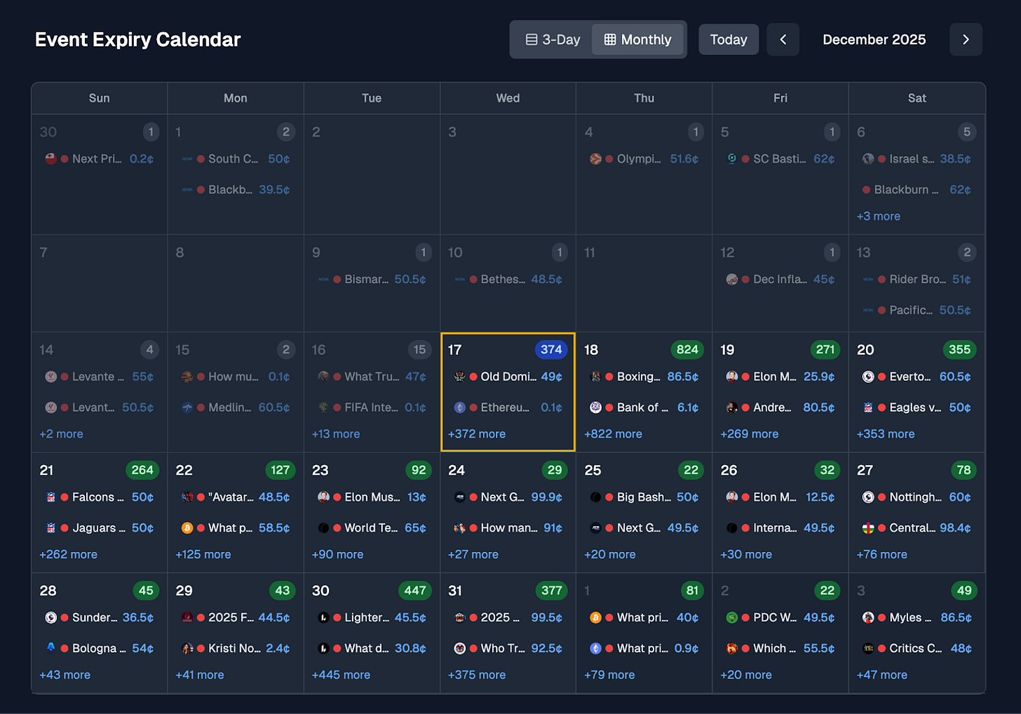 The calendar view shows what’s resolving soon and bonding opportunities. Bonding markets are still giving insane APYs, easily 200 to 400% on what are essentially risk-free positions. Compare that to AAVE giving 4-6% on USDC. It shows how capital inefficient our space still is.