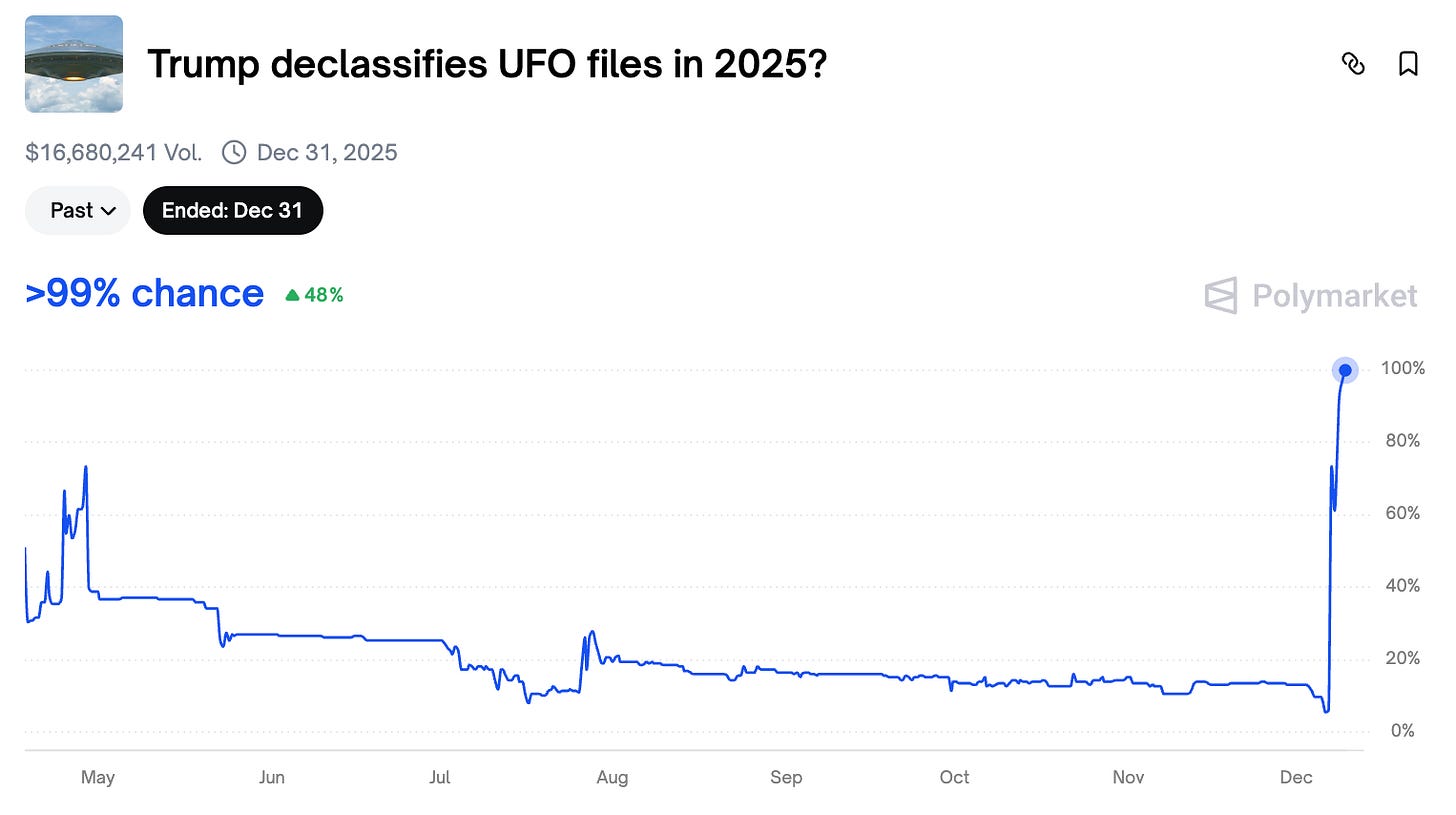 There was a recent market on whether Trump will declassify UFO files in 2025. A Pentagon office called AARO released a 10 minute video of a little speck buzzing around that was captured on some military sensor somewhere.