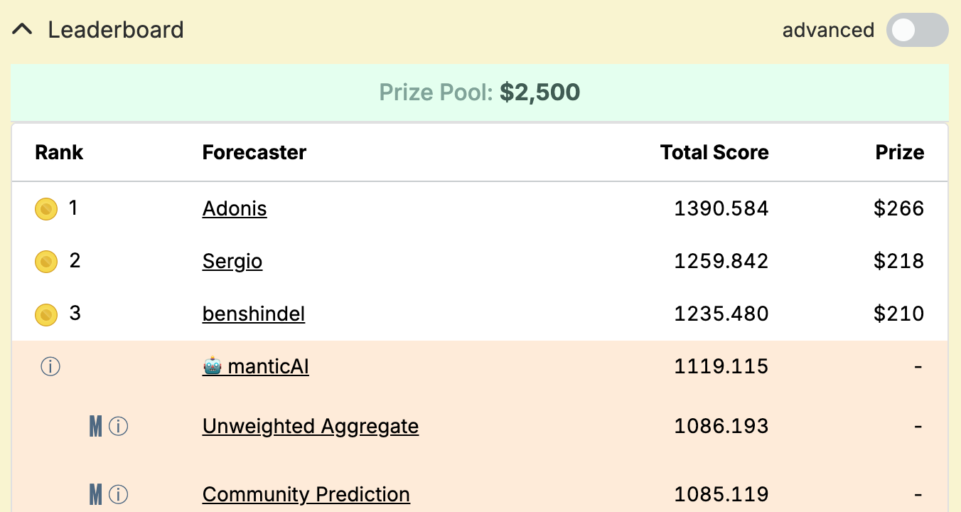 Mantic’s automated system has just placed fourth (out of roughly 500 entrants) in the 2025 Metaculus Fall Cup. This puts it well into the top 1% of human forecasters, and by far the best performing AI forecasting system that we are aware of.