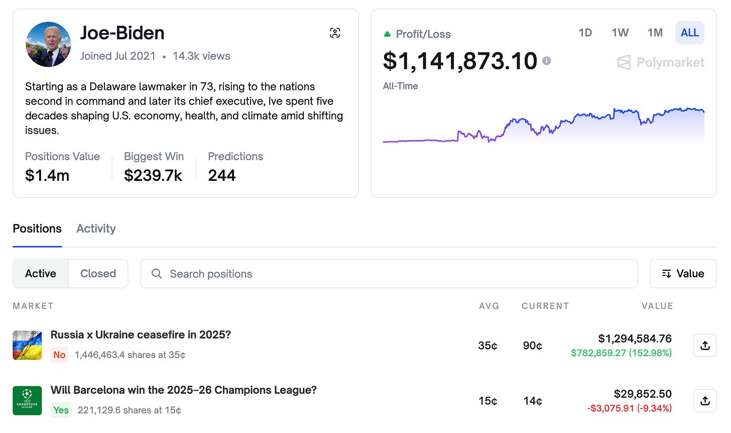 One guy, Taras, he’s a professional poker player who also likes to bet on things. He has a very clear edge on World Cup games. You might know him on Polymarket as ‘President Biden.’