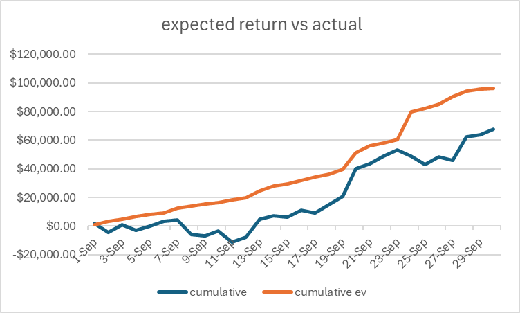 On any given NFL Sunday I might have up to $300,000 in play across various games. At the start of September I was breakeven for the whole month. I had millions of dollars in volume but had made no money. But by September 30th I was up like $60-65k. That’s just the variance you deal with.