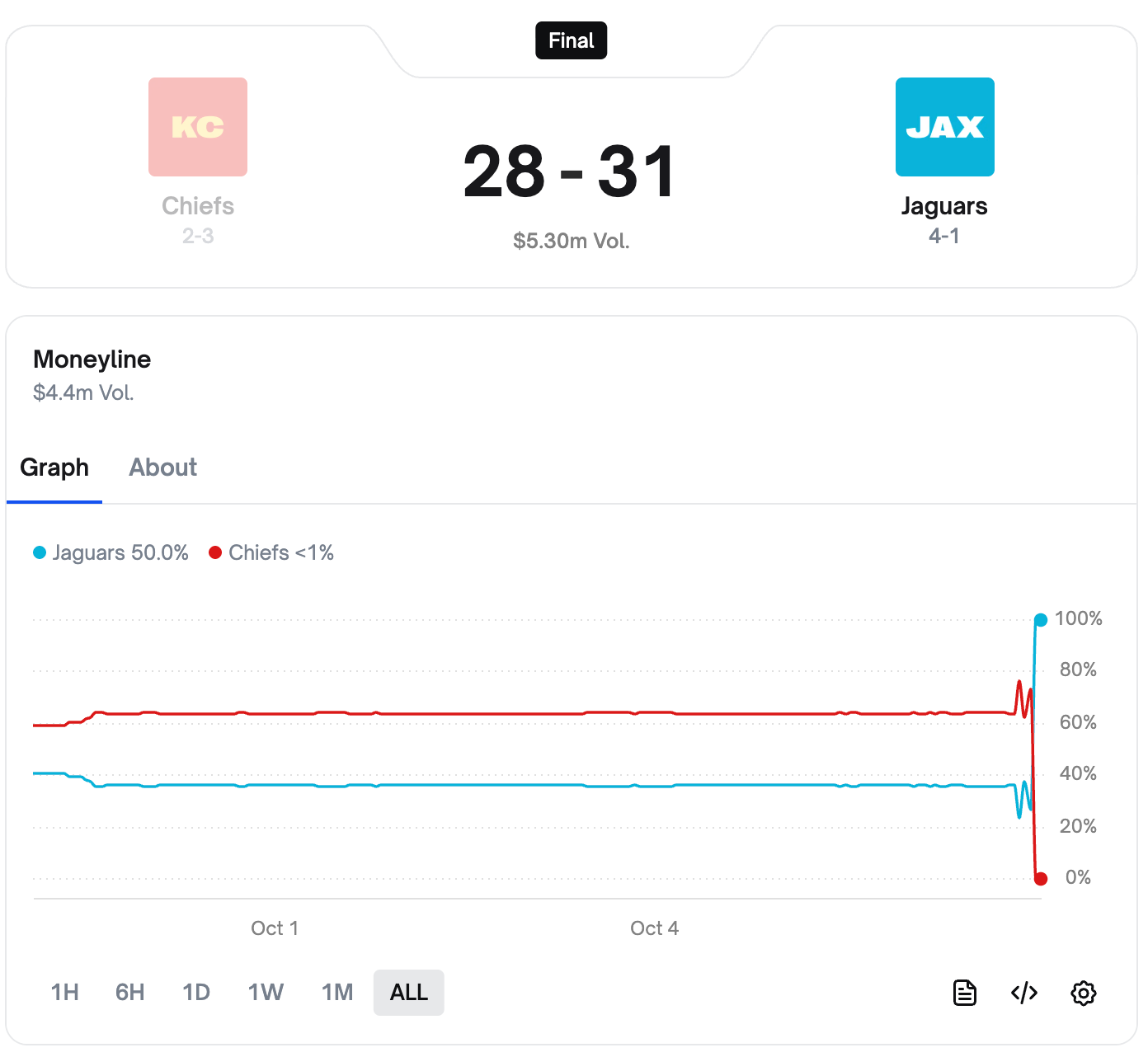 These lines move a little bit, but generally unless there’s a reason for it to move, the odds stay pretty flat. I’m getting a lot of exposure to the Chiefs at what I think is a very good price. The public was betting the Jaguars so much that they were moving the line down. The Pinnacle line was still the same, but the line on Polymarket was getting pushed down.