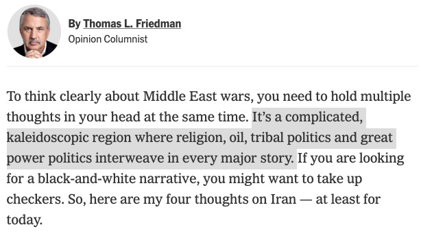 On March 2nd, New York Times columnist Thomas Friedman wrote this about the Iran war: