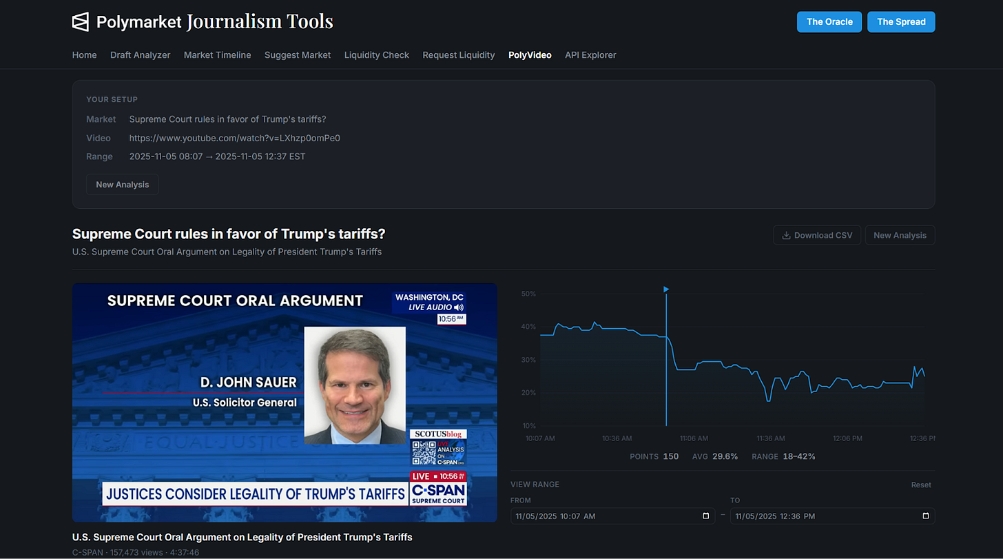 The PolyVideo tool allows you to sync Polymarket odds with a YouTube video (perhaps a debate, a senate hearing, or a supreme court oral argument).