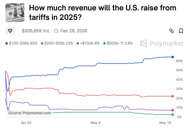 Trump’s economic team hopes that tariffs will raise revenue to offset the planned tax cuts. But the tariffs are likely to only shave $100-200B off the $7T federal budget for 2025 (🔮 65% odds)