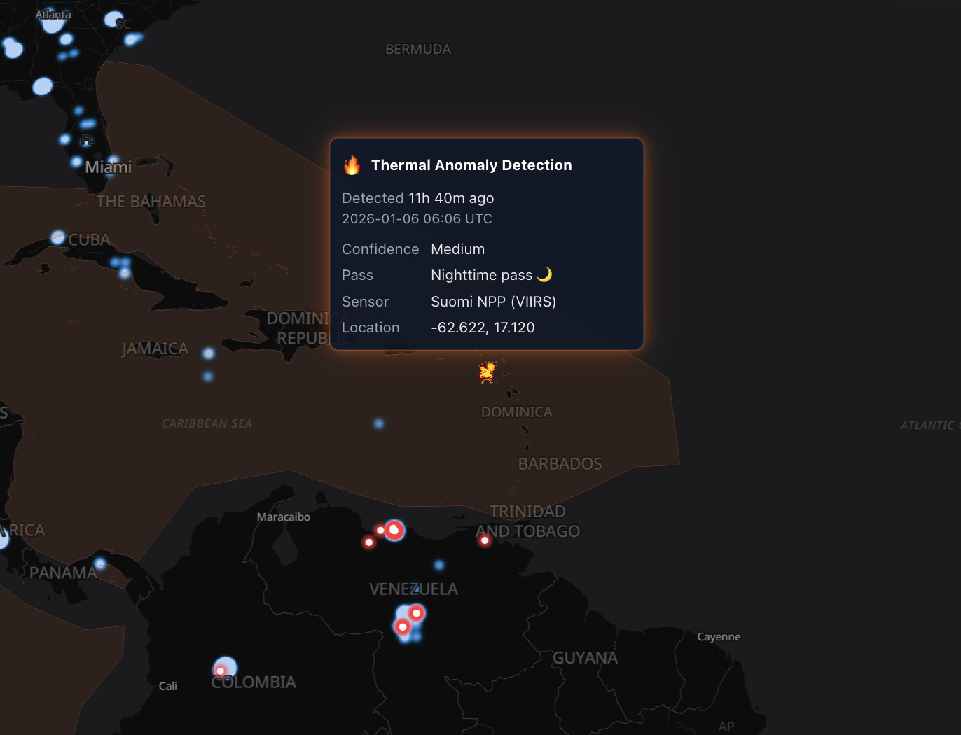As part of this, we use NASA’s FIRMS data, which tracks thermal anomalies worldwide. Using this, some of our users were able to find the exact location of a recent drug boat strike before it was publicly announced by the Pentagon. This is because NASA picked up a thermal signature in the Pacific. The strike was reported around 400 miles southwest of Acapulco, and the thermal anomaly was 410 miles southwest.