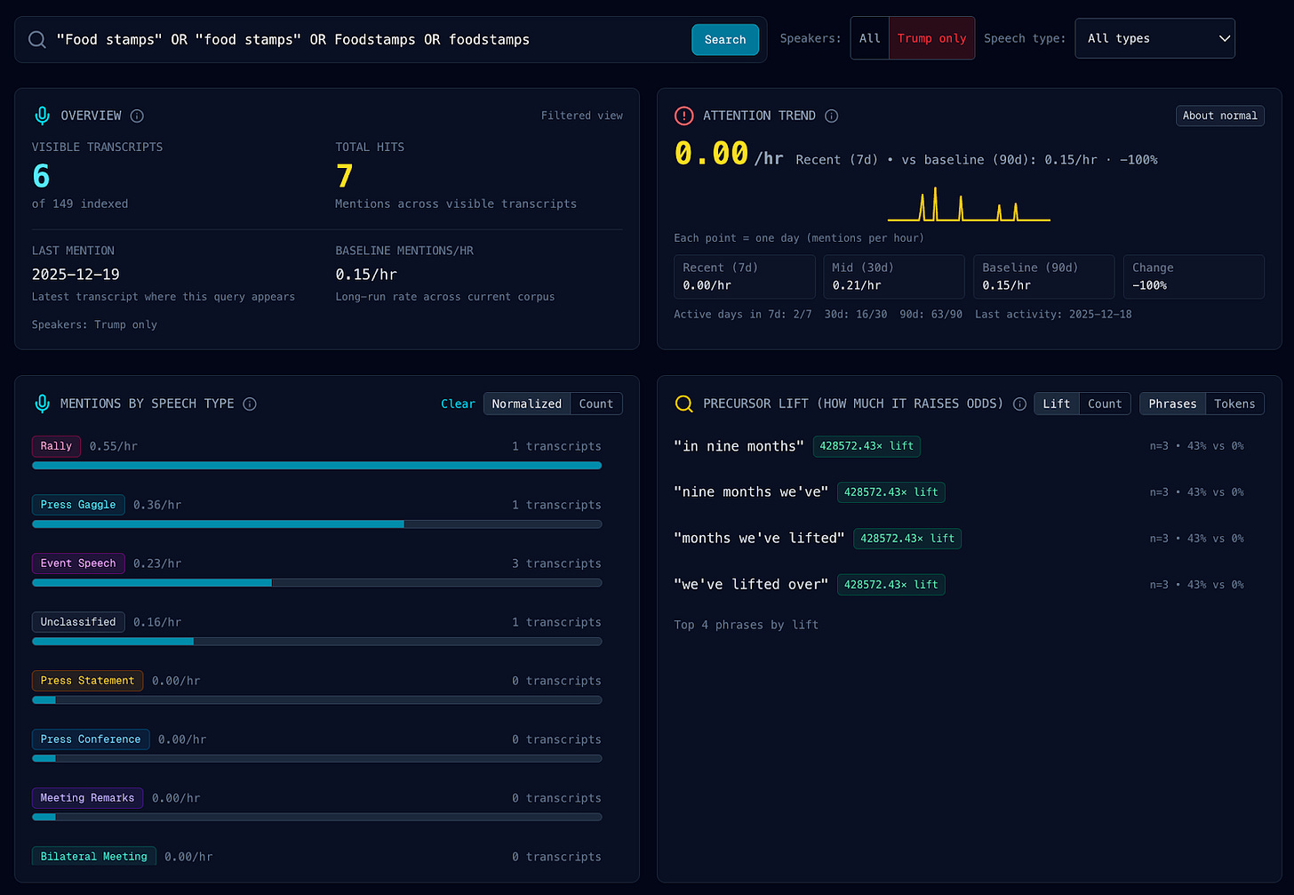 For example, the phrase “we’ve lifted over 600,000” comes before “food stamps” in multiple speeches. If you’re a mentions market trader watching live, you can be very sure that “food stamps” is coming.