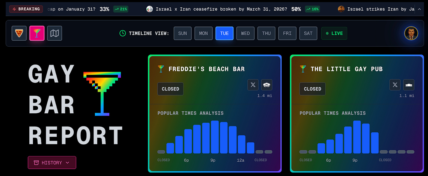 The truth is, you really don’t know. But with Venezuela, we had clearly been building up our presence in the Caribbean for weeks with the drug boat strikes, tanker seizures, and positioning troops. If you were following the news, Venezuela was the most likely candidate. The pizza data alone can’t tell you exactly what is happening. It’s an indicator that at least something’s going on. You still have to connect it to the geopolitical context yourself.
