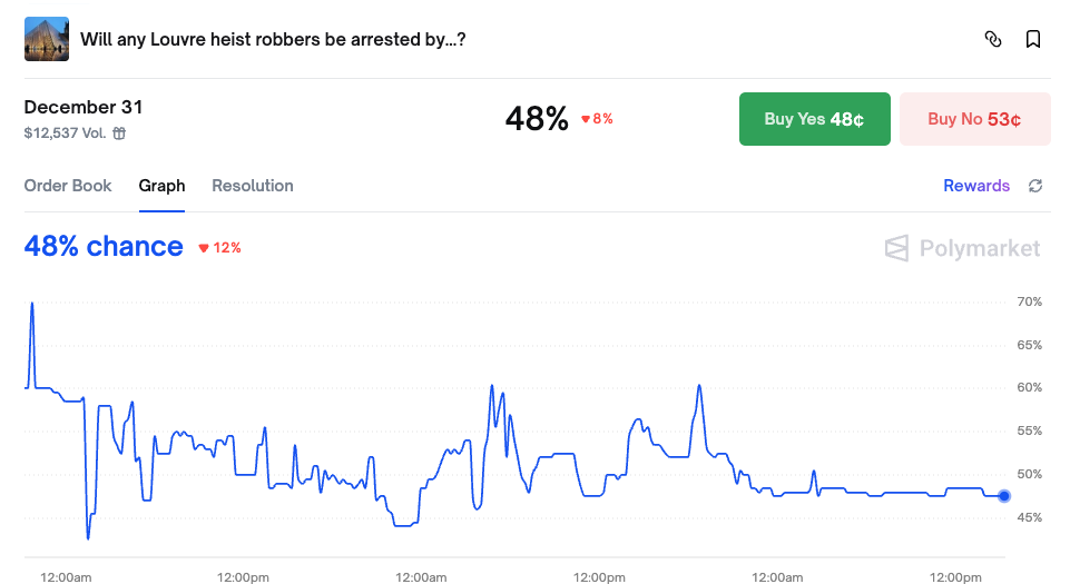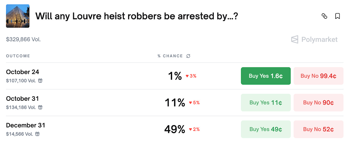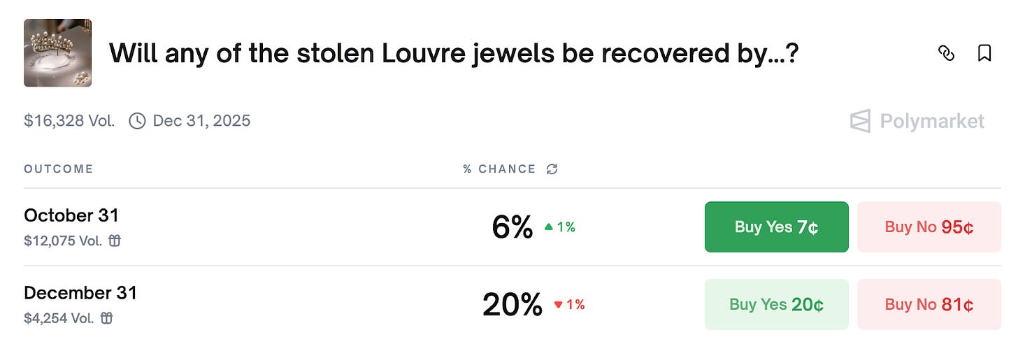 On Polymarket we see that the odds for arrests (🔮 49% by end of year) are much higher than the 20% odds for recovering any of the eight jewels that are still missing (one was dropped by the thieves during the getaway).