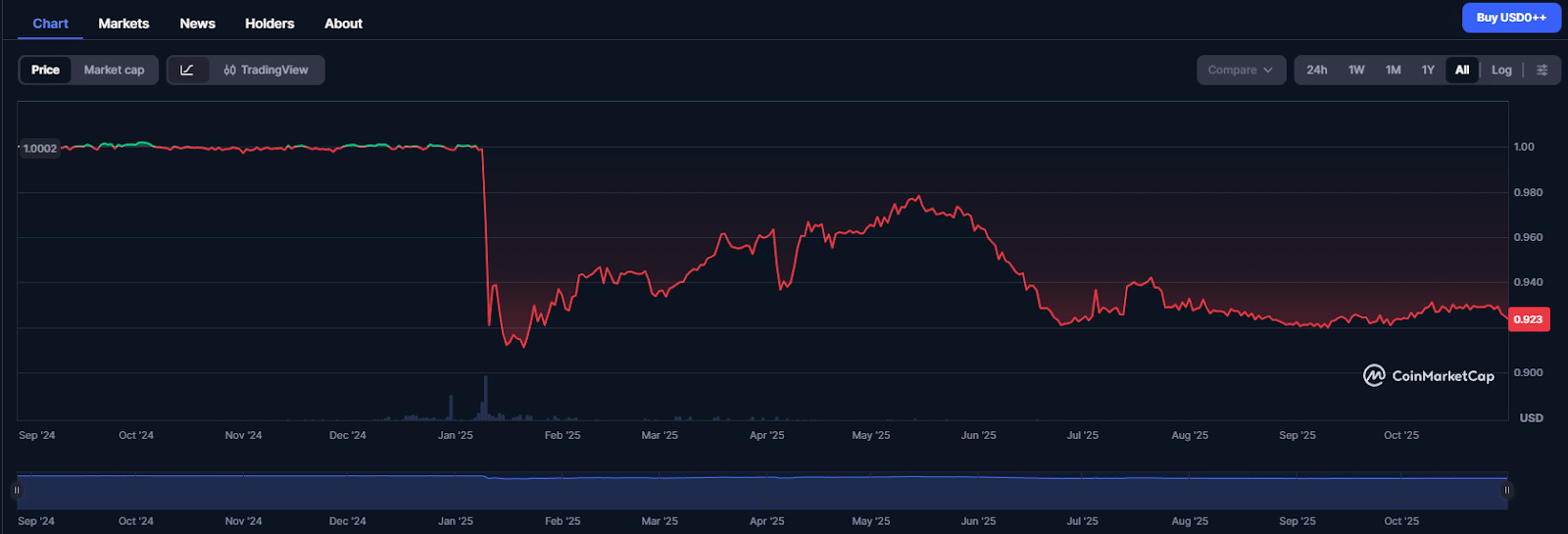 While USD0 has not depegged before, the staked version (USD0++) has. The stakedtoken used to be redeemable at a 1-to-1 ratio for the stablecoin, but the team suddenly set a price floor for redemption of $0.87, causing mass panic and a repricing of the USD0++ coin.