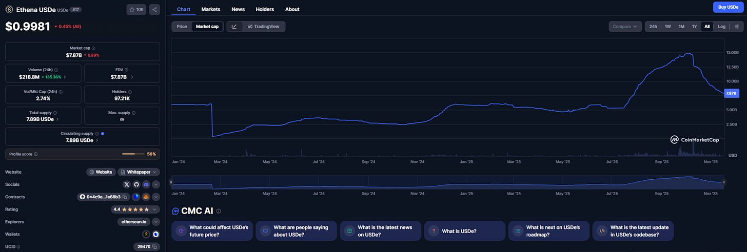 USDe is a crypto collateral backed stablecoin created by Ethena Labs. Rather than being backed by dollars or cash equivalents, it is backed by crypto tokens that are hedged delta-neutral to generate yield.