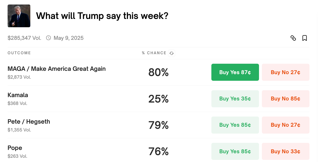 For the Flip. Finally, there is a style of prediction market trading where users buy shares cheap and hope to flip them to a greater fool before the market settles. For example, say Trump posts another AI pope meme or makes another remark about becoming Pope (🔮 76% chance he says the word “Pope” this week). This could easily create a mini hype bubble that would allow Thecordius to offload shares he paid .3 cents each for a 2X, 3X or more - even as the absolute odds of Trump becoming Pope remain below 1%.