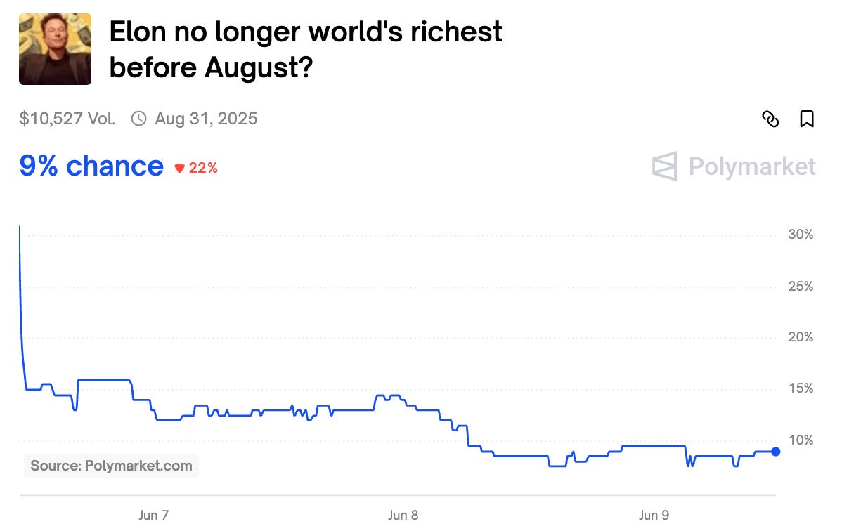 But Polymarket traders don’t seem to believe there’s a serious threat to Elon’s business empire: only a 9% chance that he loses the world’s richest man title by August.