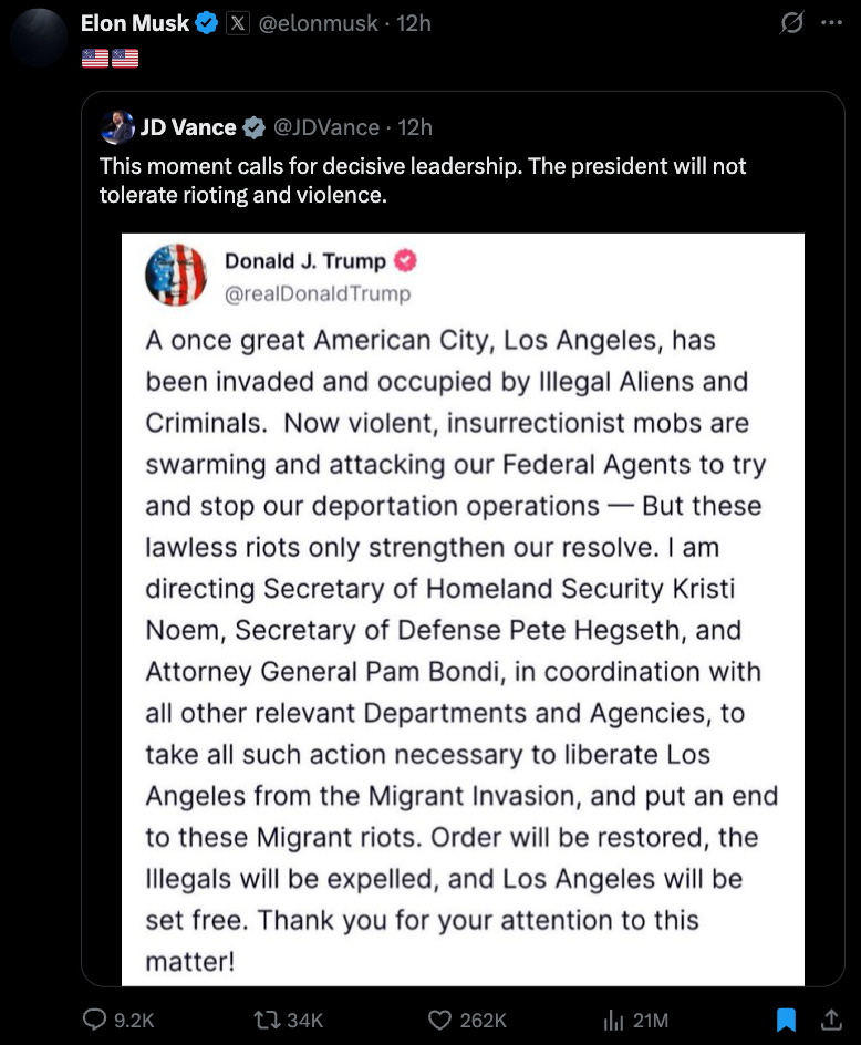Over the weekend, Musk extended an olive branch by deleting his most inflammatory tweets and posting approvingly about Trump’s response to the clashes in LA.