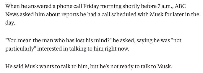 The largest drop in odds for a patch-up came after Trump appeared on ABC and said he was uninterested in speaking with Musk: