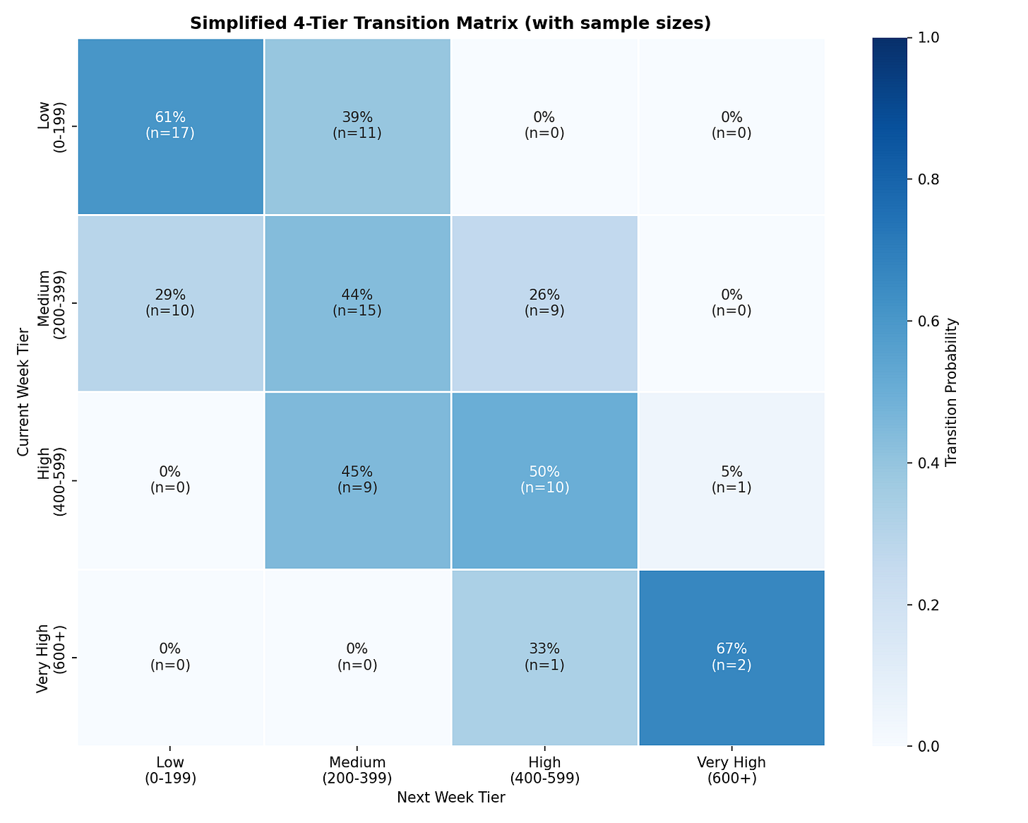 In the chart above, we see that a “Low” week (0 - 199 tweets) has a 61% probability of being followed by another “Low” week. A 39% chance of stepping up to “Medium” (200 - 399), and negligible odds of leaping to “High” or “Very High.”
