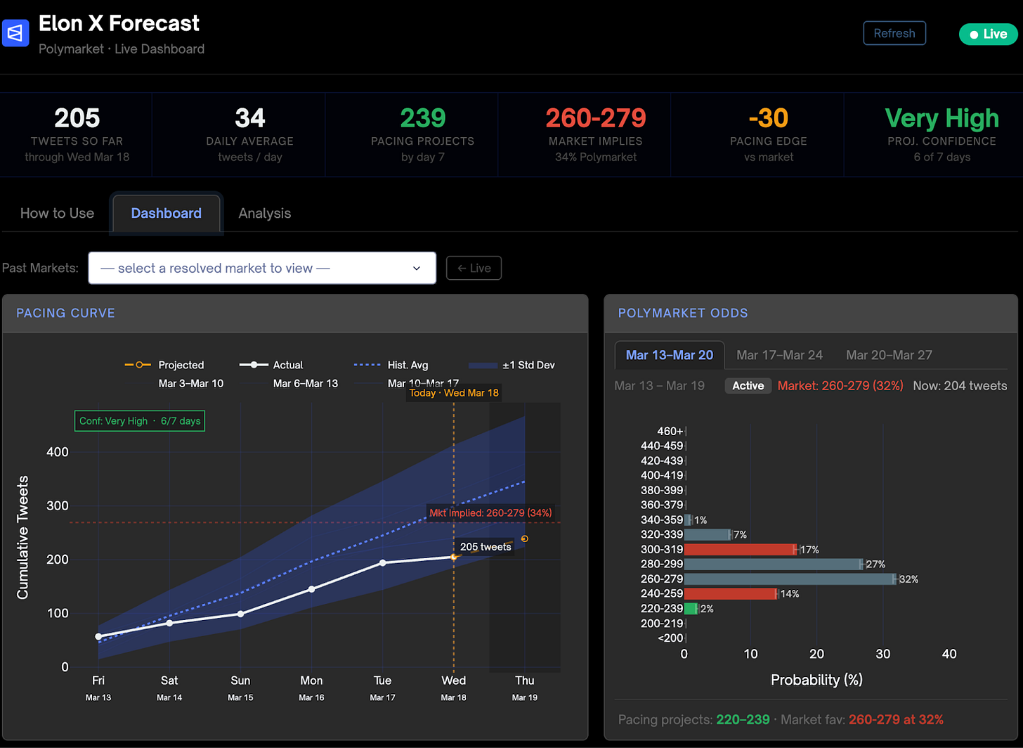 It combines a live pacing curve with the Polymarket data from the current weekly tweet markets, giving you a real time dashboard for Elon tweet trades.