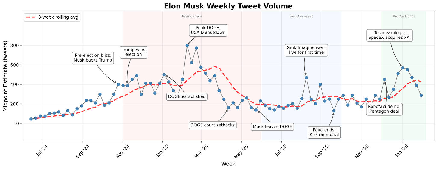 Looking back at the data gives a window into Elon’s recent arc. We see a steady uptrend through the 2024 election, a blowoff top in the DOGE era, and a second surge in late 2025 as Musk pivoted back to Tesla, xAI and SpaceX.