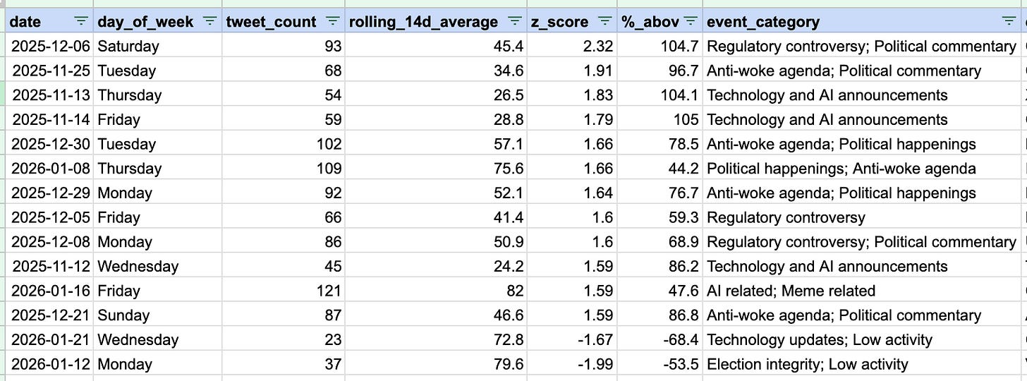 I used a 14-day window to compute the rolling average. This is because the base rate of Elon’s tweets moves with events. This adaptive approach ensures outliers are flagged relative to the current “normal,” capturing surprises as trends shift. The below table shows the types of events that can cause outliers in the data: