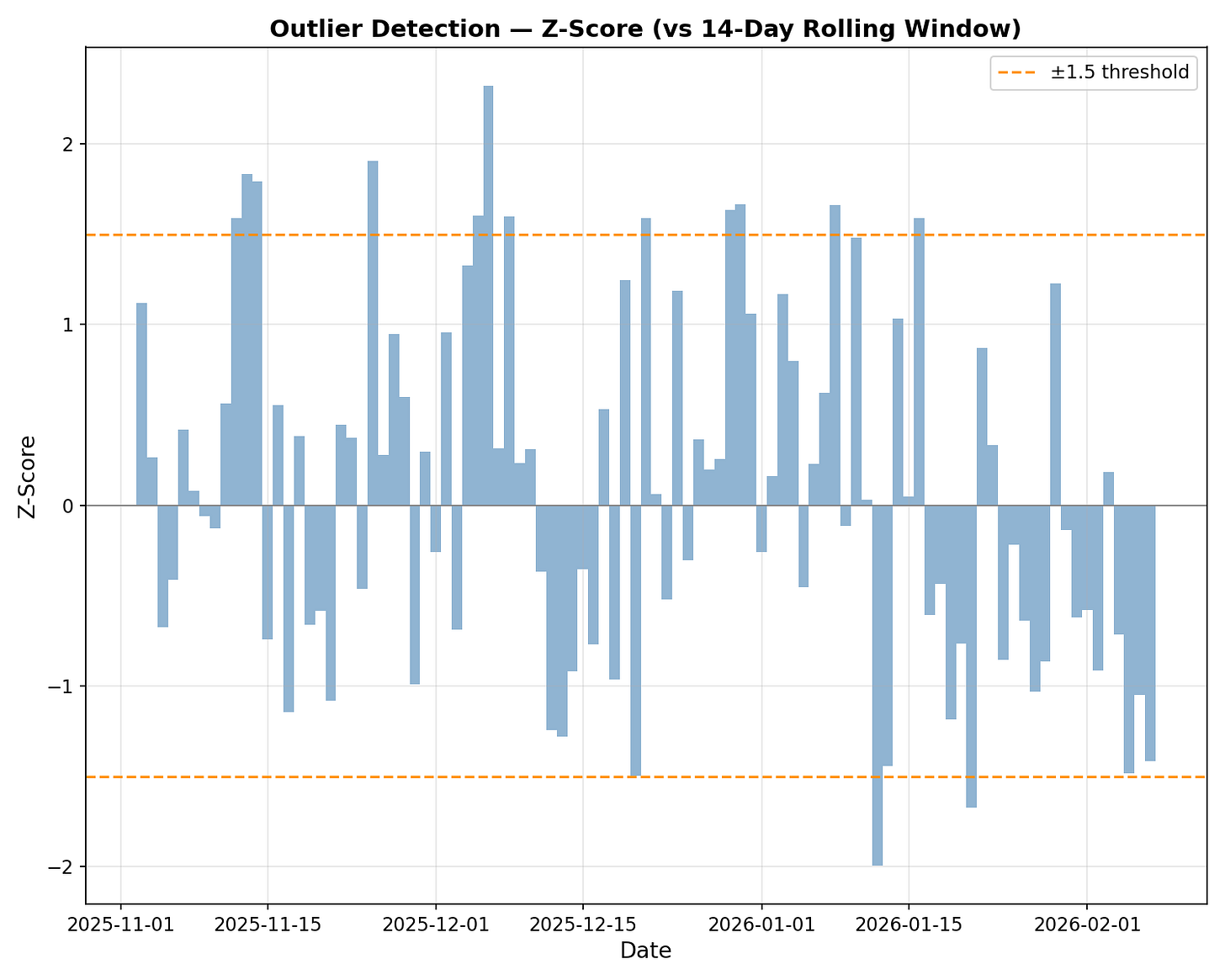 The z-score tells us how far off today’s count is from the rolling 14-day average. A positive z-score indicates above-average spikes, while a negative one signals below-average dips.