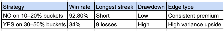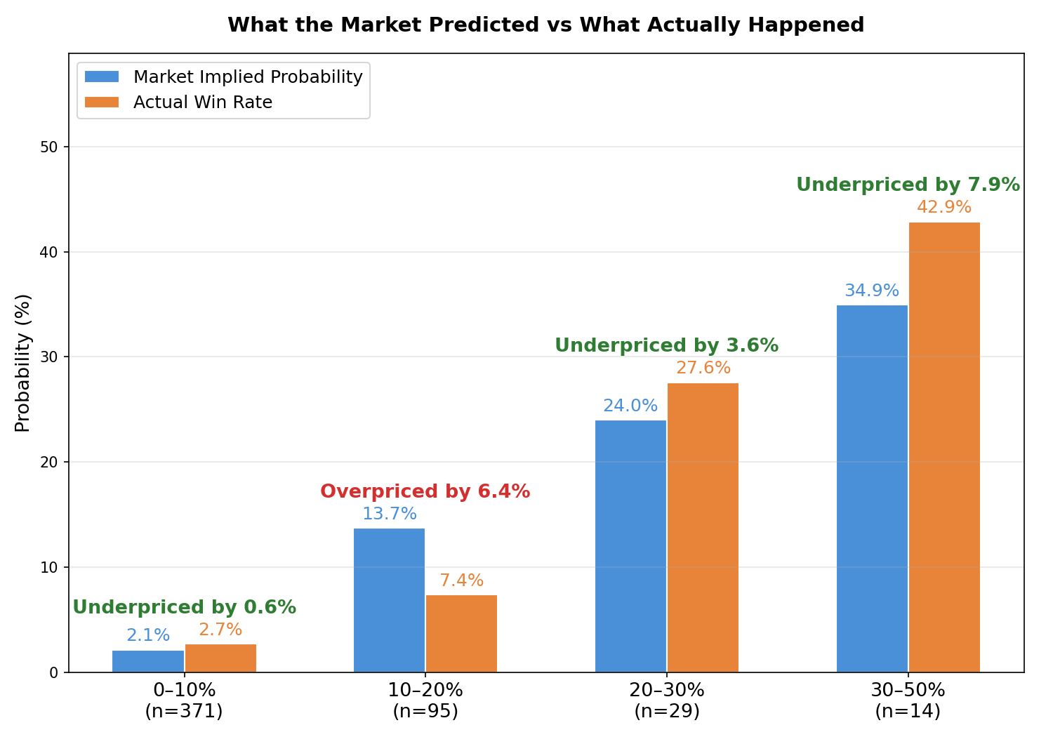 In the diagram above, buckets in the 10-20% range have an actual win-rate of 7.4% despite being priced at 13.7%. Meanwhile, the buckets priced from 30-50% win ~43% of the time, more often than the implied odds of 34.9%.