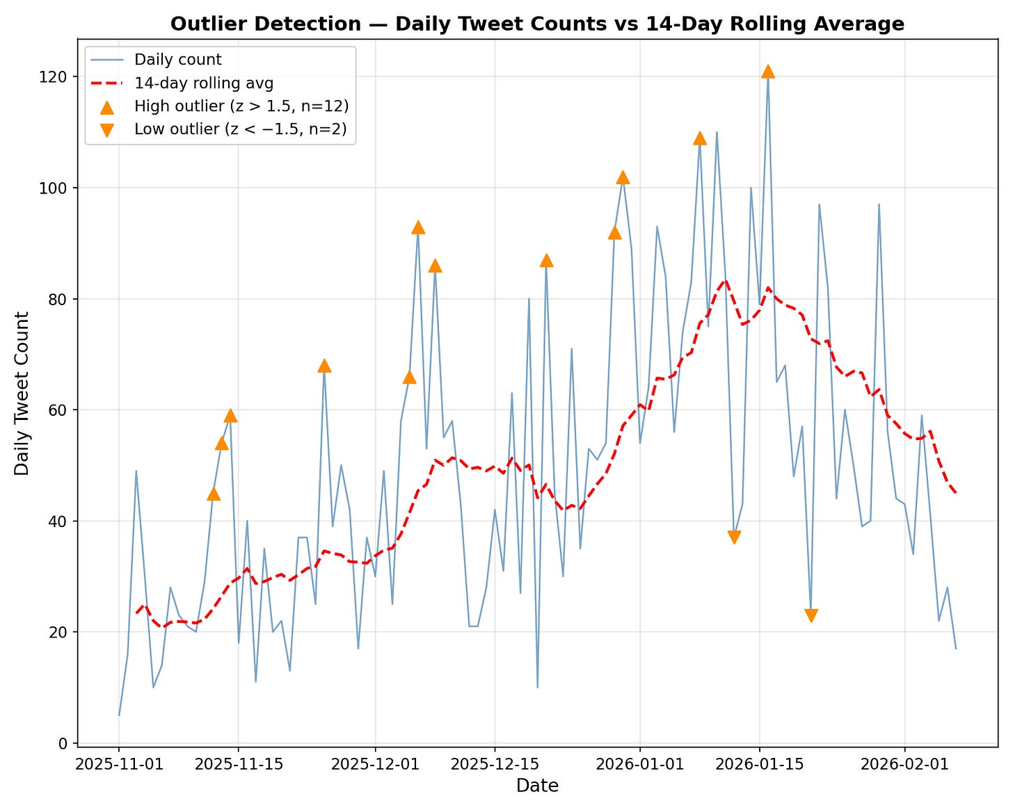 The diagram above plots actual daily tweets against a moving average of the prior 14 days, highlighting periods where volume strays from recent norms.