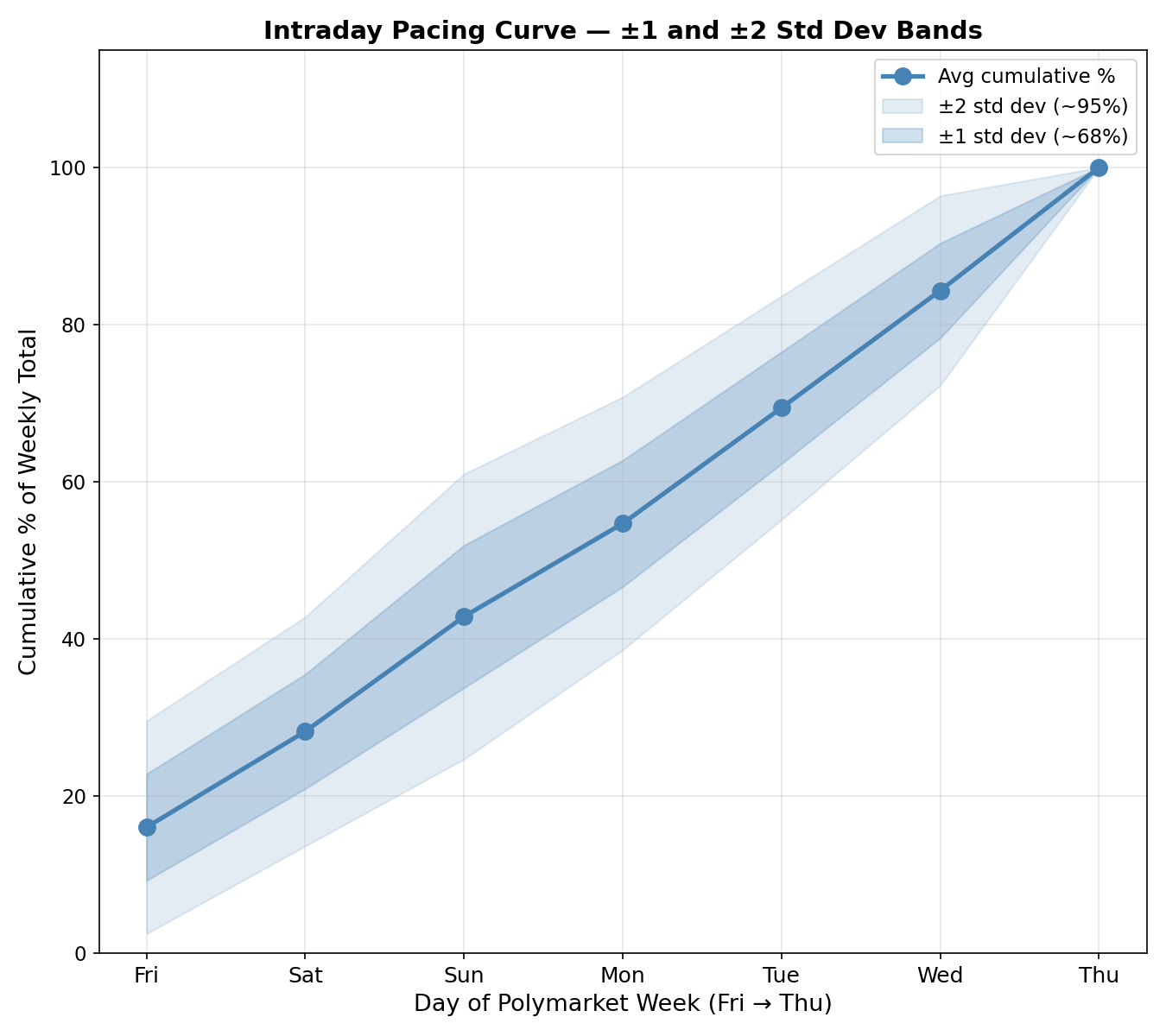 As the week unfolds, track the pacing curve, by midweek, 69% of weekly volume is typically posted, enough to project a final total and compare that against Polymarket prices.