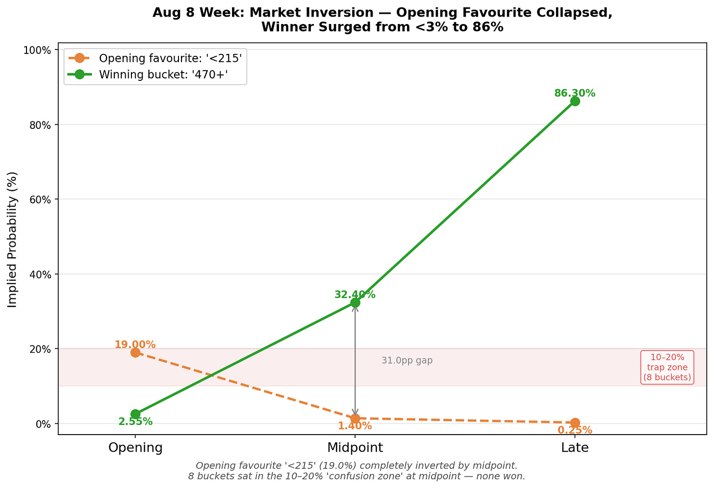 The market opens expecting a quiet week where “<215” is the favorite at 19%. The eventual winner, “470+” sits at 2.55 cents. Nobody is prepared for what is coming.