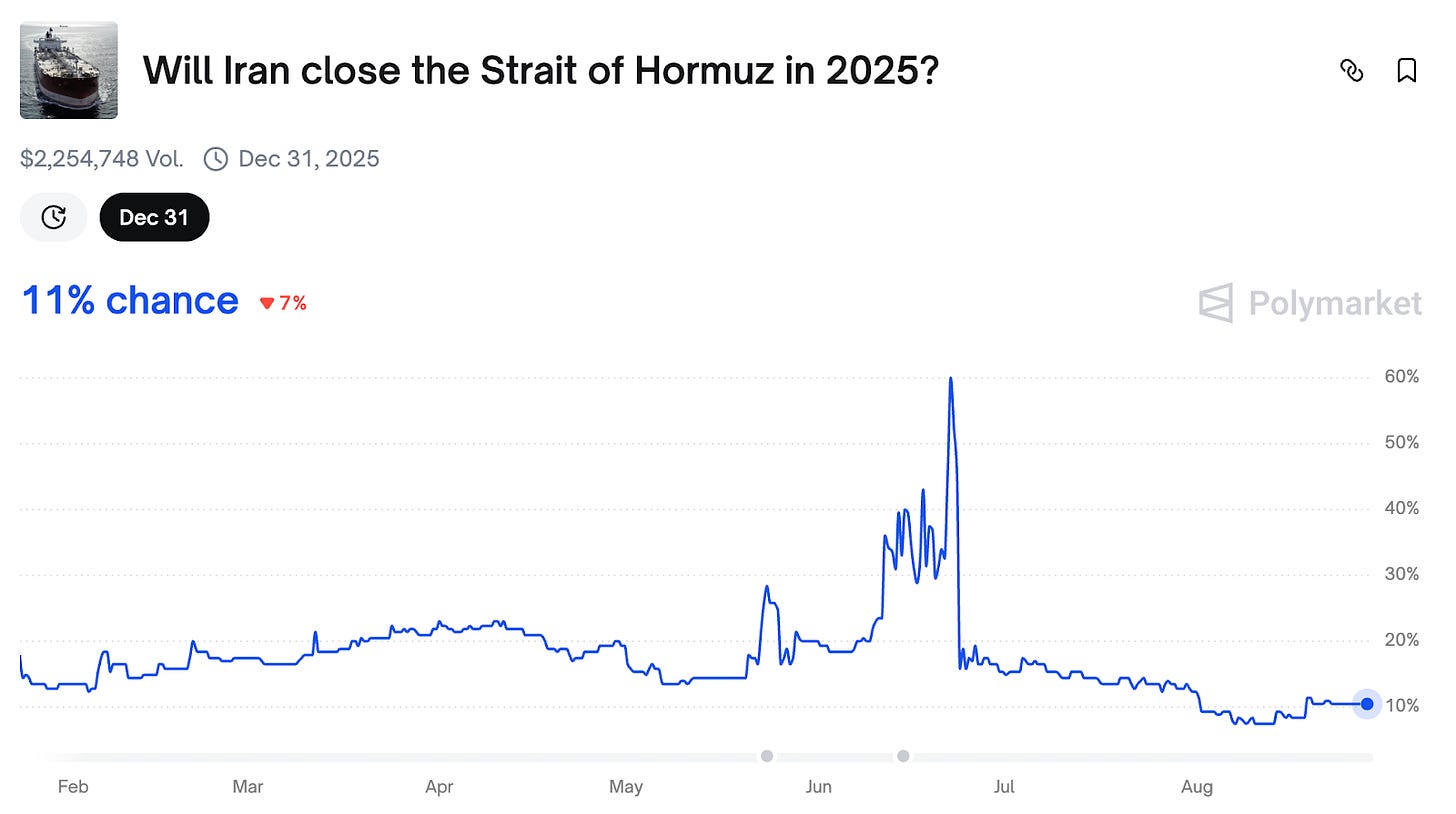Take the 12-day war between Iran and Israel. Polymarket had the Strait of Hormuz closure trading at various levels. But I track two key pair trades: landed LNG in Europe versus Brent crude, and WTI versus Brent. If the markets truly believed Iran would close the strait, we'd have seen huge divergences in that spread.