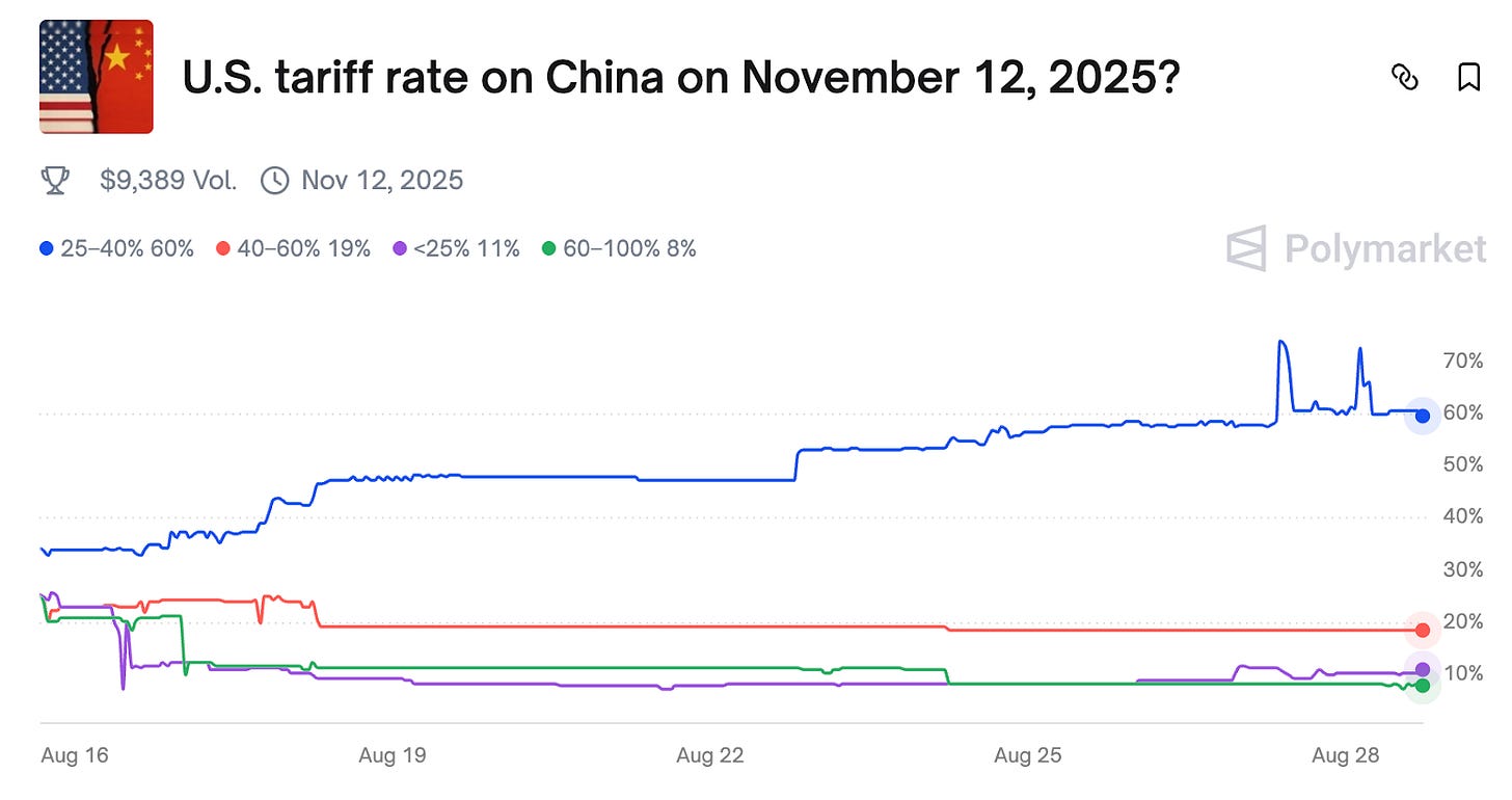 The market on where China tariffs will be in November, 60% chance of being in the 25-40% range seems about right. Trump can set tariffs as an economic decision, but can't use them as a geopolitical weapon against countries where he lacks leverage, China, India, Brazil, Russia.